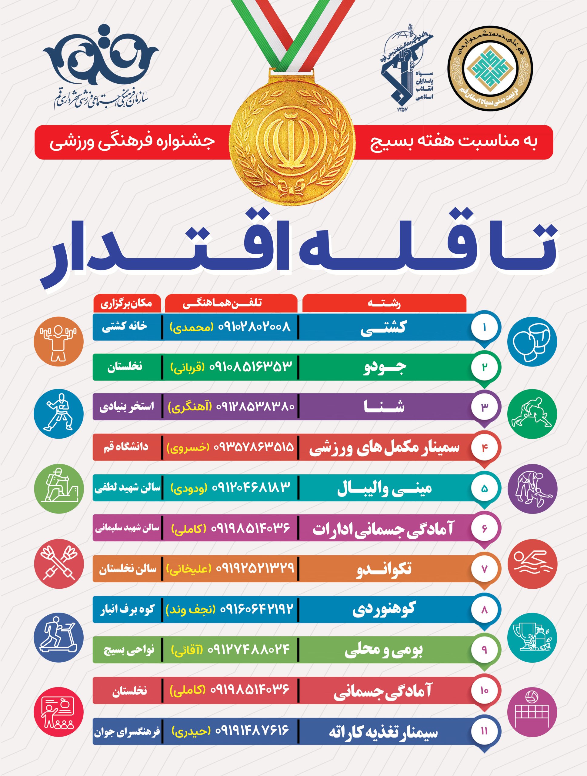 «طراحی ۱۱ رویداد تخصصی در رشتههایی مانند کشتی، جودو، شنا، تکوآندو، کوهنوردی، والیبال، بومیمحلی، آمادگی جسمانی، سمینارهای علمی ورزشی و دورههای تغذیه ورزشی، بهویژه برای نوجوانان و خانوادهها، محصول همین نگاه جامع است. سازمان فرهنگی شهرداری قم در این دوره تلاش کرده ورزش را نه فقط یک فعالیت بدنی، بلکه یک برنامه فرهنگی ـ اجتماعی تعریف کند.»