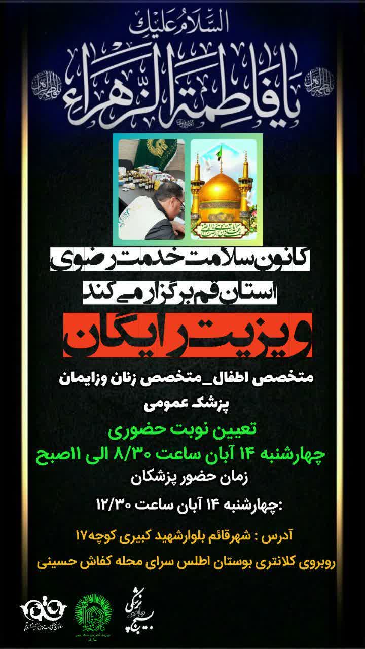 به مناسبت ایام شهادت حضرت فاطمه زهرا (سلاماللهعلیها)، طرح ویزیت رایگان خادمیاران رضوی با همکاری سازمان فرهنگی اجتماعی ورزشی شهرداری قم و بسیج جامعه پزشکی استان روز چهارشنبه ۱۴ آبانماه ۱۴۰۴ در سرای محله بوستان اطلس منطقه شهر قائم قم برگزار میشود.